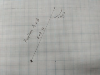 Jadi untuk penjumlahan A + B akan menghasilkan jawaban yang sama walaupun dikerjakan dengan 3 metode yang berbeda dengan hasil 6,58 N dengan arah sudut -113 derajat seperti gambar berikut: